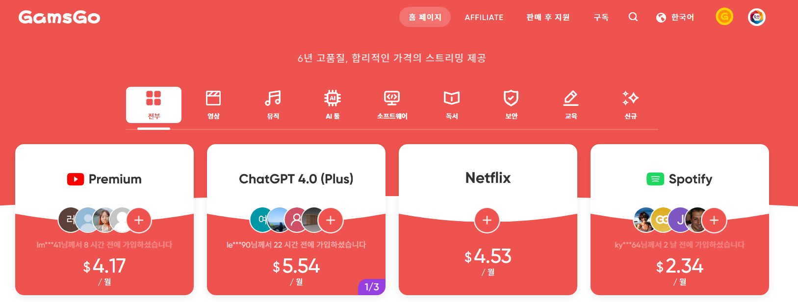 구독료가 부담되셨다면, 겜스고는 정말 괜찮은 대안입니다. 매달 나가는 비용은 줄이고, 프리미엄 퀄리티는 그대로 누릴 수 있습니다. 저도 지금은 넷플릭스, 스포티파이, 유튜브 프리미엄까지 전부 겜스고로 이용하고 있습니다. 한 달만 써보세요. 왜 사람들이 열광하는지 알게 되실 거예요.